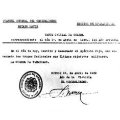 Reproducción del lacónico parte en el que se anuncia el final de la Guerra Civil.