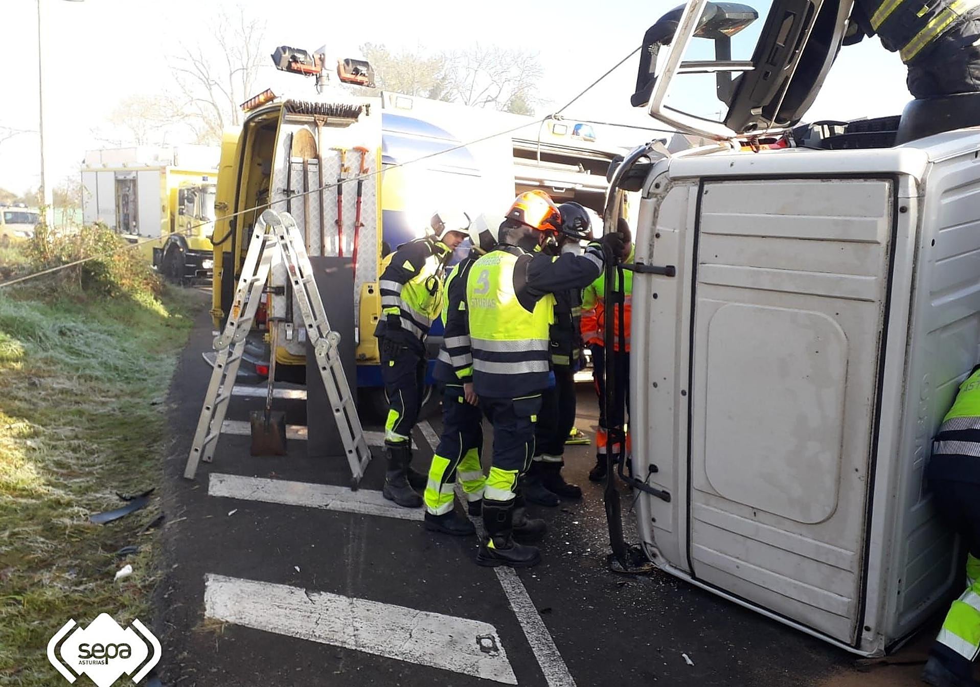 Por parte de Bomberos del SEPA además de la dotación, con 8 efectivos y vehículo de primera salida, furgón multisocorro, tres de transporte de personal y uno de mando del parque de La Morgal, se activó al jefe de zona centro-este que acudió al incidente, el Vehículo de Apoyo Logístico con material específico para este tipo de accidentes con un operario de apoyo técnico y un remolque con arena y sepiolita.