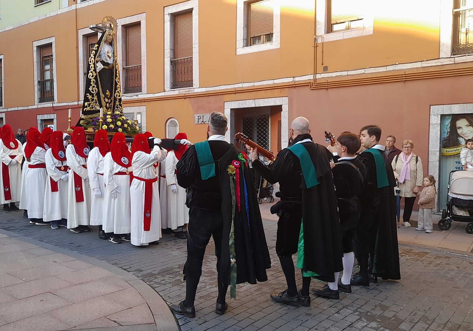 La comitiva, encabezada por la Agrupación Musical San Salvador de los Estudiantes, tuvo un ambiente ligero a lo largo de todo el recorrido, pero destacó especialmente la parada junto al parque, justo al final de la calle Manuel Pedregal. Fue allí, cuando se hizo el giro en el que el Cristo se muestra ante la Virgen y esta «se alza al aire», con el baile del Encuentro entre ambos pasos. «¡Con la Virgen y hasta el cielo!», gritaron en voz alta los cofrades con los aplausos de todos los presentes.