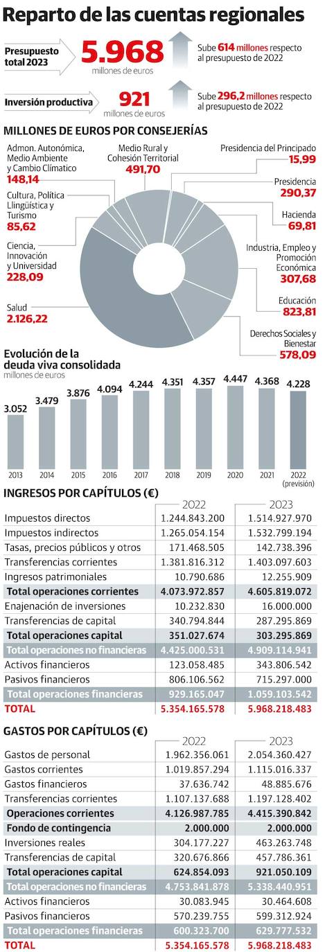 Los presupuestos del Principado rozarán por primera vez los 6.000 millones de euros en 2023, y lo harán con objetivos claros. En un ... ejercicio en el que se celebrarán elecciones autonómicas, Asturias volverá a superar récords en las cuantías generales. 5.968 millones de euros es la cifra global de la que se parte, que podrá aún ser enmendada en el trámite parlamentario de la ley en la Junta General, para el que ya cuenta con 23 votos de 45 (los 20 del grupo socialista, dos de IU y uno del grupo mixto), en unas cuentas en las que más de uno de cada tres euros, 2.054 millones, se destinarán a pagar los sueldos de la plantilla, tras el reciente acuerdo de actualización de los salarios del personal del Principado.
