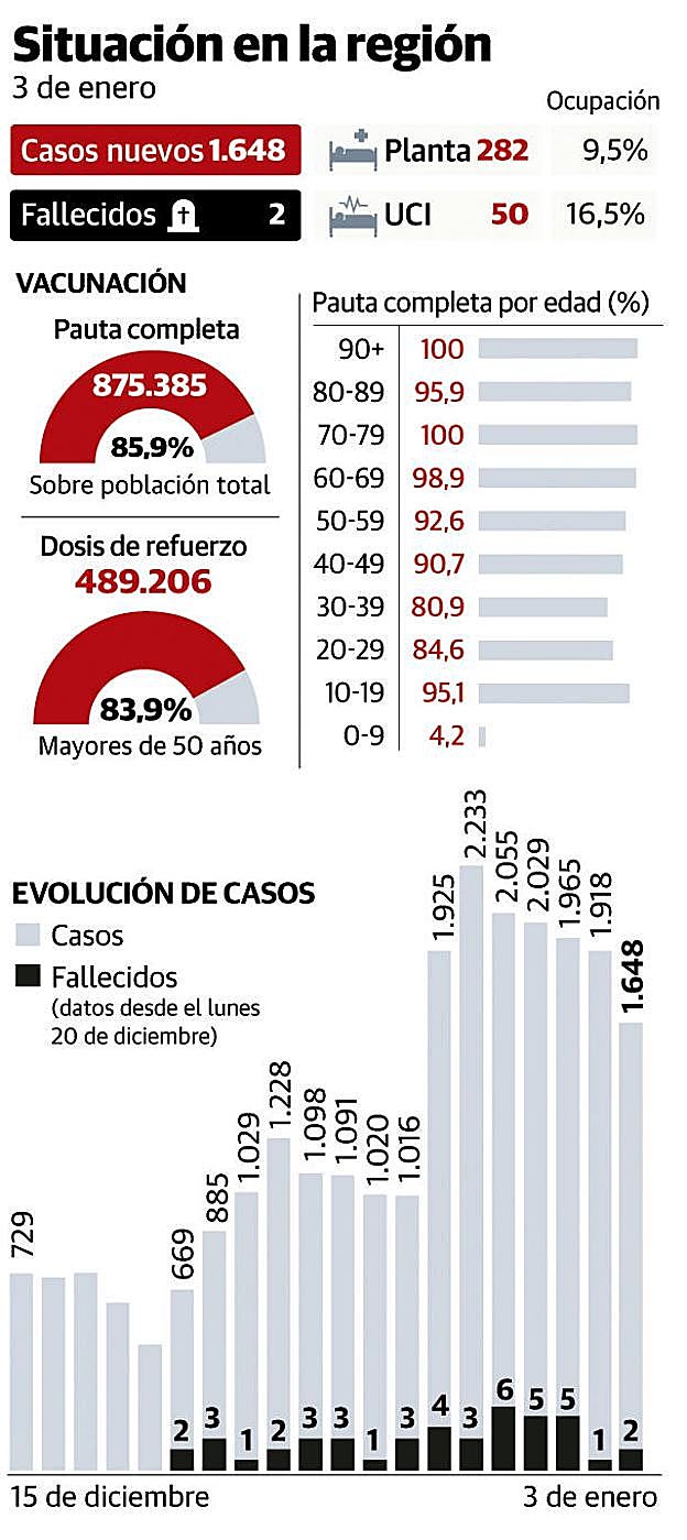 La variante ómicron no da tregua. La tasa de ocupación de las UCIs es del 16,5% y 332 personas permanecen hospitalizadas en planta. Hay que sumar el fallecimiento de dos mujeres, de 93 y 97 años. Con todo, los contagios bajaron ayer por tercer día consecutivo, con 1.648 en total, lo que supone 270 casos menos que el lunes, si bien siguen siendo cifras muy elevadas.
