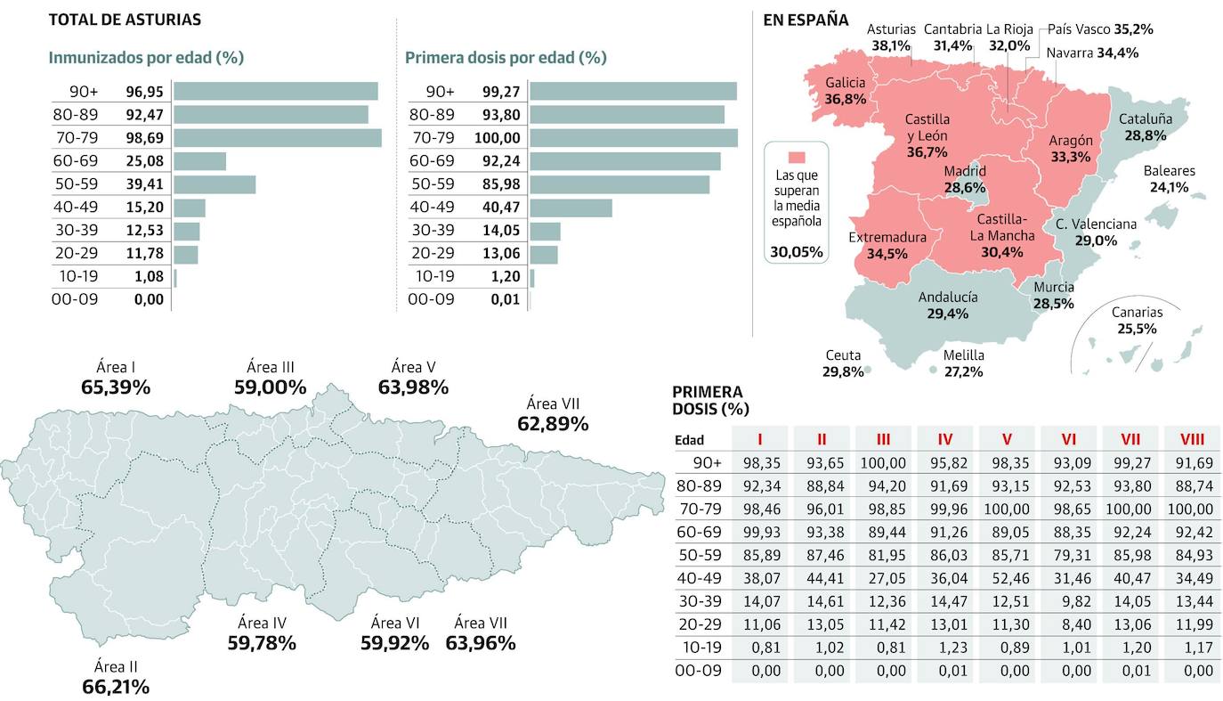 Asturias sigue siendo la región que más rápido está vacunando a su población. Diez puntos por encima de la media del país y la única que el viernes había superado el 60%. Le sigue de cerca Galicia y Castilla y León. Eso en lo referente a la primera dosis. Sobre la pauta completa, también es la primera con casi 8 puntos más que la media nacional y, por ejemplo, diez más que Madrid.