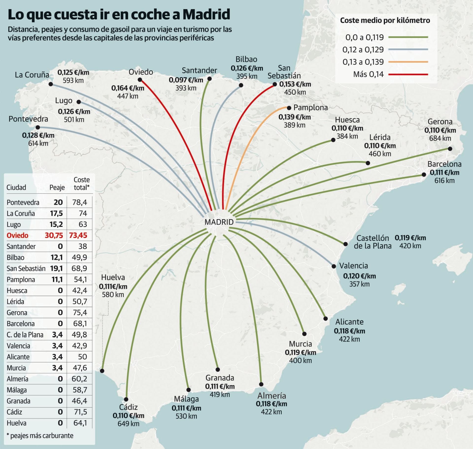 Con esos datos, se hizo la comparativa de cada viaje, buscando los itinerarios preferentes (con más autovía) que ofrece la aplicación de Vía Michelín y su cálculo de costes. El resultado admite poca discusión. Viajar a Madrid con ese coche, el diésel a ese precio y pasando por el peaje del Huerna (AP-66) y el de los túneles de Guadarrama (AP-6) exige 73,45 euros desde Oviedo; supone un esfuerzo de 0,164 euros por kilómetro recorrido. A nadie en la periferia peninsular le sale tan costoso el desplazamiento por carretera a la capital del país.