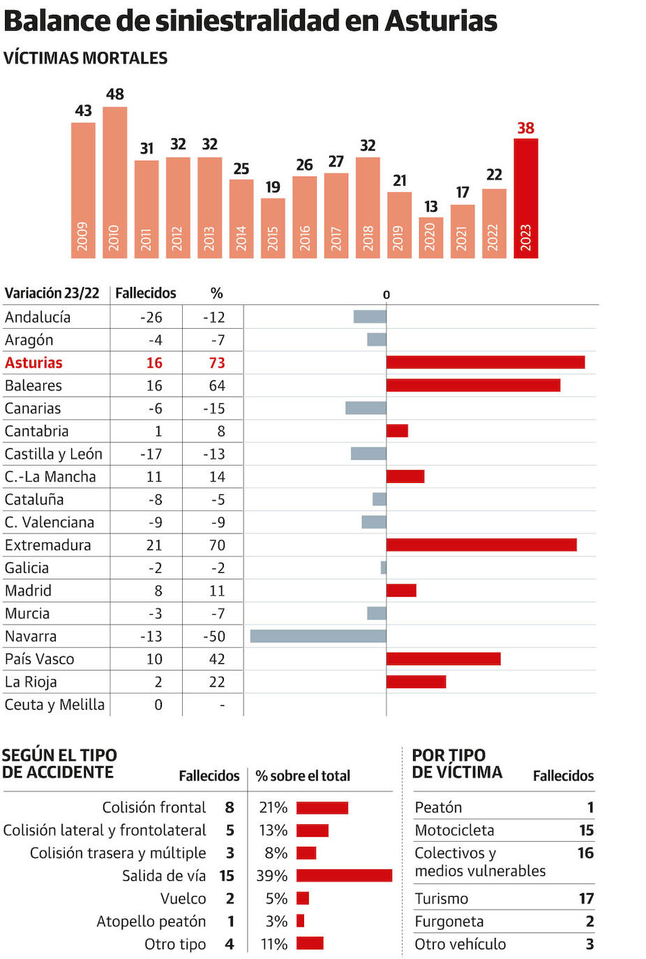 Año negro en las carreteras asturianas con 38 fallecidos, la cifra más alta desde 2010