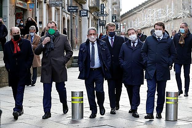 Ocho presidentes autonómicos sentados a una misma mesa, representando a tres partidos diferentes y, aparentemente, pocas discrepancias. Aunque los equipos de todos los ejecutivos regionales habían pulido el documento final para que lo de ayer en Santiago fuera, como quien dice, para firmar y hacerse la foto, aún hubo que darle un último empujón. Los 35 puntos que componen finalmente la Declaración llegaron a ser medio centenar en el borrador con el que se trabajaba a primera hora de la mañana.
