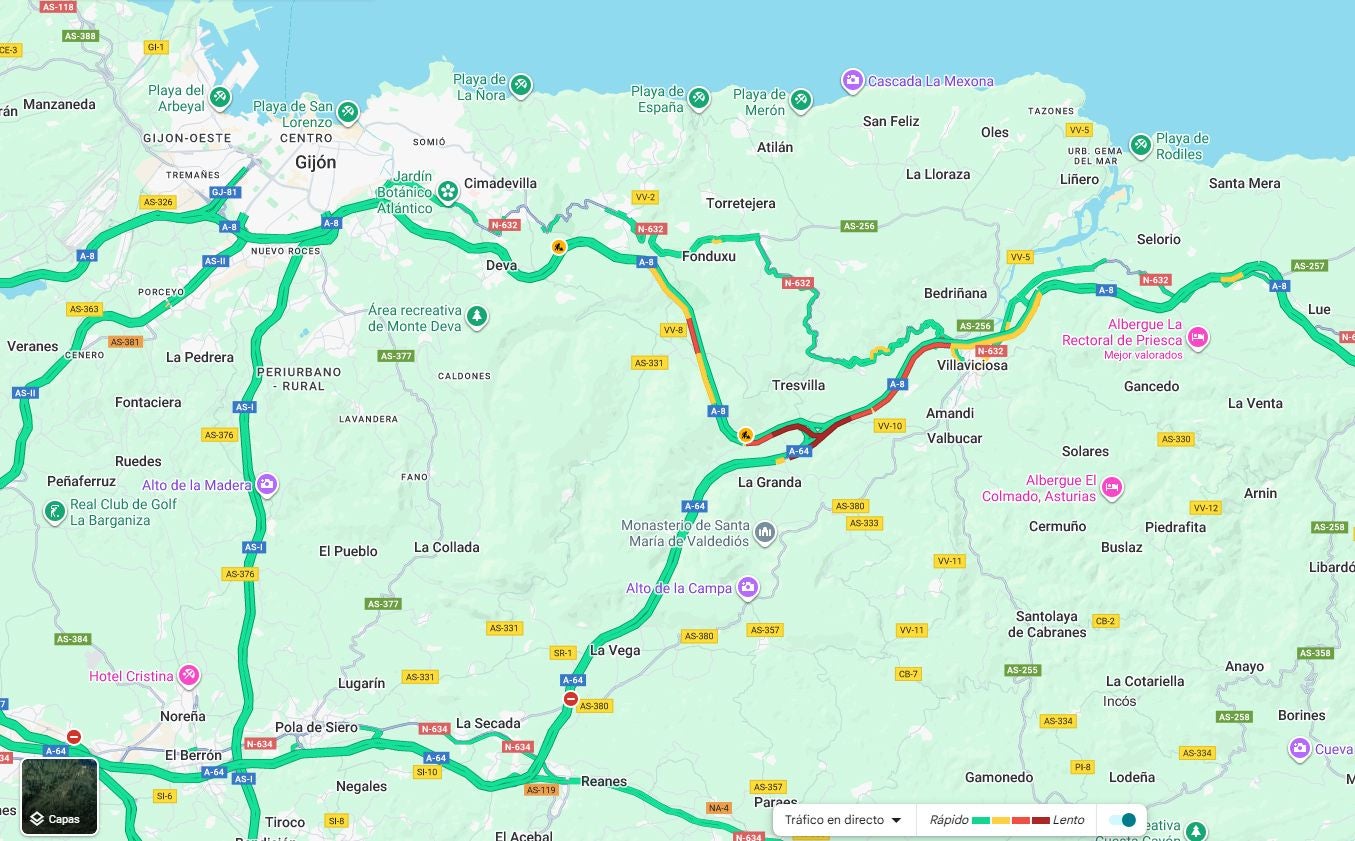 A lo largo de unos siete kilómetros el tráfico es muy lento e, incluso, por momentos llega a estar parado. Esta situación afecta a los conductores que se dirigen a las playas maliayas tanto desde Gijón por la Autovía del Cantábrico como desde Oviedo por la A-64.
