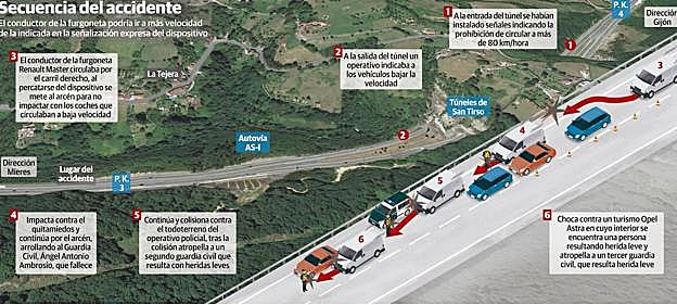 «Fue todo muy rápido, en un momento el vehículo estaba sobre nosotros». Los agentes de la Unidad de Seguridad Ciudadana (USECIC) de la Comandancia de Oviedo así lo reconocían. No se pudo hacer nada. El primero al que atropelló fue el agente ÁngelAntonio Ambrosio Barbero, de 47 años y natural de Mieres. Falleció.