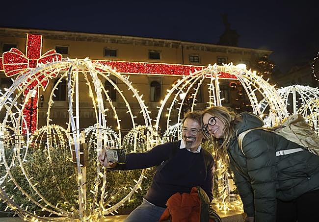 Es encender las luces de Navidad y que la gente salga en masa a la calle. La agradable temperatura que predominó durante toda la jornada y la emoción correspondiente al día siguiente del tradicional encendido navideño provocaron que gijoneses y turistas se lanzasen a la calle para disfrutar de «un recorrido muy alegre» y conocer las principales novedades de la iluminación de este año. «Son mucho más originales que el año pasado», afirmaba Diego Crespo nada más sacarse un 'selfie' con su mujer y su hijo Mateo, de cuator años, delante del gran lazo rojo que cuelga de la fachada del Antiguo Instituto. Durante la tarde de este sábado concentró la atención de todos los paseantes que se adentraban en la plaza del Parchís y ya se ha convertido en la gran sorpresa de estas Navidades. «Está precioso, sobre todo por el efecto de las 'bolonas' colgantes», le decía Viviana Comino a su marido, Javi Cordero.