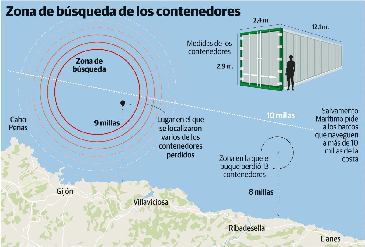 Ayer, en cuanto las condiciones meteorológicas lo hicieron posible, el avión de Salvamento Marítimo Sasemar 102 volvió a las labores de búsqueda y localizó al menos otros cuatro contenedores, esta vez a unas nueve millas náuticas frente a la Mariña, entre Villaviciosa y Gijón. Primero ubicó un contenedor de color marrón semihundido y con las puertas abiertas, y casi a la vez otro blanco, que flotaba bien. Posteriormente localizó otros dos contenedores, ambos rojos, rodeados por «muchísima mercancía en caja flotando en las inmediaciones de los contenedores».