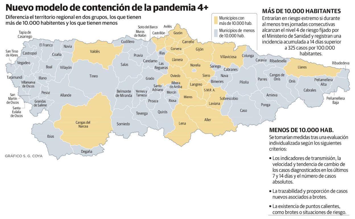 El nuevo modelo asturiano de medidas también trae consigo una redefinición sobre qué hacer ante un repunte de la incidencia. No se ha querido tocar la filosofía del conocido como 'sistema 4+' porque, en palabras de Adrián Barbón, «ha funcionado» pero sí los criterios. La primera diferencia sobre el que aún está en vigor, y que tiene a Llanes en máxima alerta hasta el jueves, es que solo habrá dos grupos: los concejos con más de 10.000 habitantes y los que tienen menos. Asociado a ello, los requisitos de entrada. Para los grandes, se simplifica: una incidencia acumulada a 14 días (IA 14) superior a los 325 casos y si permanecen al menos tres jornadas en el nivel 4 de riesgo según el mapa semafórico del Ministerio de Sanidad; en el caso de los menos poblados no habrá límites prefijados, solo indicadores a tener en cuenta: la tendencia y velocidad en la transmisión de casos, la trazabilidad y la detección de brotes.