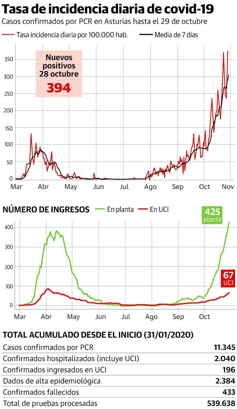 La situación de la pandemia se agrava en Asturias. Ayer se confirmaron 394 nuevos positivos por coronavirus, la cifra más alta de contagios contabilizada en un solo día, hasta el momento, en la región. No fue este el único dato negativo de una jornada en la que, además, se registraron siete fallecimientos, 84 nuevos ingresos hospitalarios por covid-19, y en la que la tasa de positividad se situó en el 7,4% (2,4 puntos por encima del 5% que marca la OMS). La mayoría de los fallecidos son ancianos: cuatro mujeres de 82, 88, 93 y 98 años y tres varones de 72, 76 y 93. Dos de los hombres residían en centros de personas mayores. Según Salud, en la última semana, Asturias registró 11 brotes en residencias de mayores, con al menos tres casos de covid, y 235 positivos entre residentes y profesionales entre el 20 y el 26 de octubre. A los que hay que sumar otros 28 centros de mayores con algún caso confirmado.