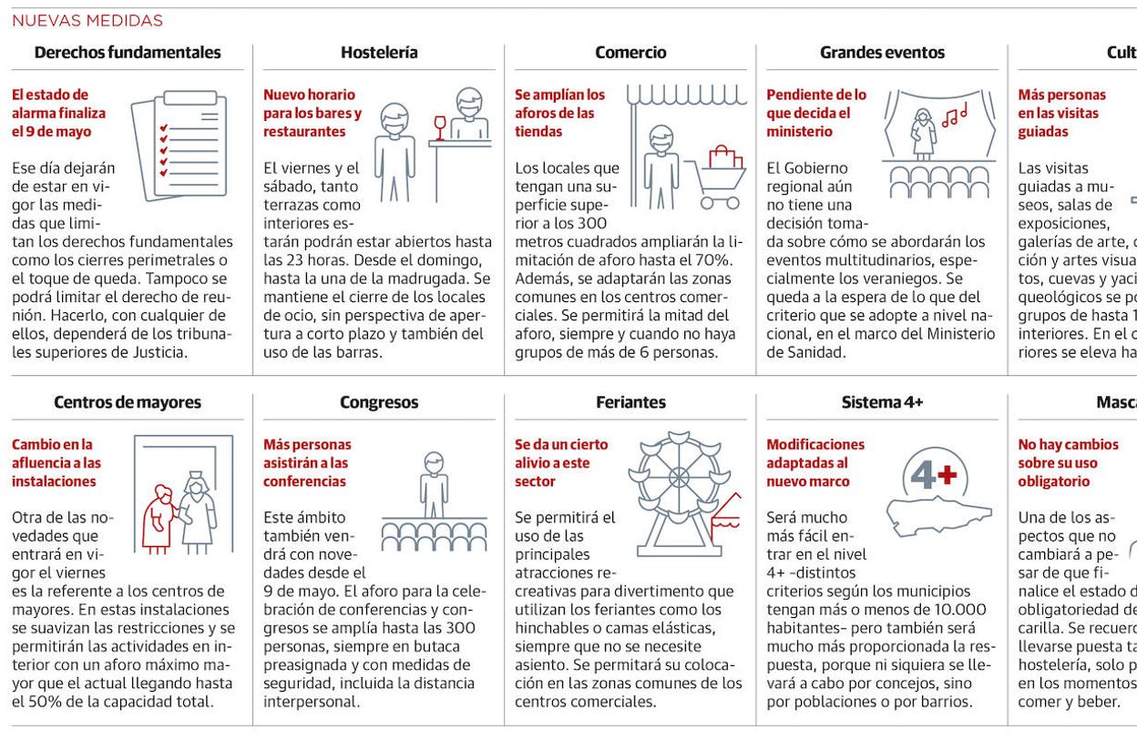 El Gobierno regional avanzó ayer las líneas generales de las medidas que vendrán a cubrir el vacío que deja el fin del estado de alarma el próximo día 9. «Prefiero hablar de suavizar restricciones que de flexibilizarlas», señaló el presidente, Adrián Barbón. El Principado se enfrenta a una dicotomía: dar un respiro a algunos sectores ante la positiva evolución epidemiológica y del ritmo de vacunación; y por otra, evitar que cale la idea en la población de que el fin del estado de alarma signifique que se cierre la crisis sanitaria. «Hay que evitar triunfalismos», insistió el jefe del Ejecutivo.