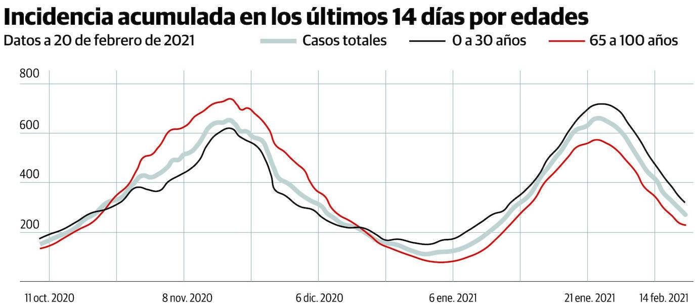 Una de las principales diferencias entre la segunda ola y la tercera que aún padecemos es el segmento de población más golpeado por el virus. De modo resumido: la covid-19 atacó mucho más a los mayores durante la segunda oleada y ha estado más protegida en esta nueva tanda. Y con los jóvenes ha sucedido exactamente lo contrario: su incidencia en noviembre y diciembre fue menor a la de la media, pero en las últimas semanas ha sido un tramo especialmente afectado.