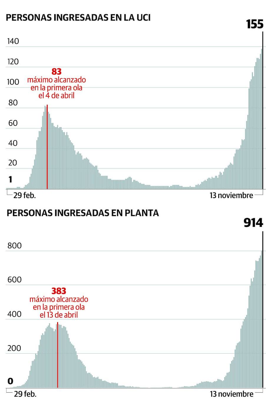 Asturias, que roza ya la cifra de los 18.500 contagios y sumaba hasta ayer 686 fallecidos, está en el grupo de las ocho comunidades autónomas que supera la incidencia media del conjunto del país y es, junto con Aragón, Castilla y León, Cataluña y La Rioja -además de las ciudades autónomas de Ceuta y Melilla- la que registra una ocupación de camas UCI superior al 40%. Los datos del Principado inidcan que en los ocho últimos días ingresaron en los hospitales de la región casi 600 enfermos de covid. Y otros cerca de 100 en la UCI. En realidad, según los estadísticas del Sespa, en el Principado estarían ocupadas ya el 68% de las 240 camas disponibles, razón por la que se van a habilitar nuevos espacios para críticos hasta en en quirófanos.