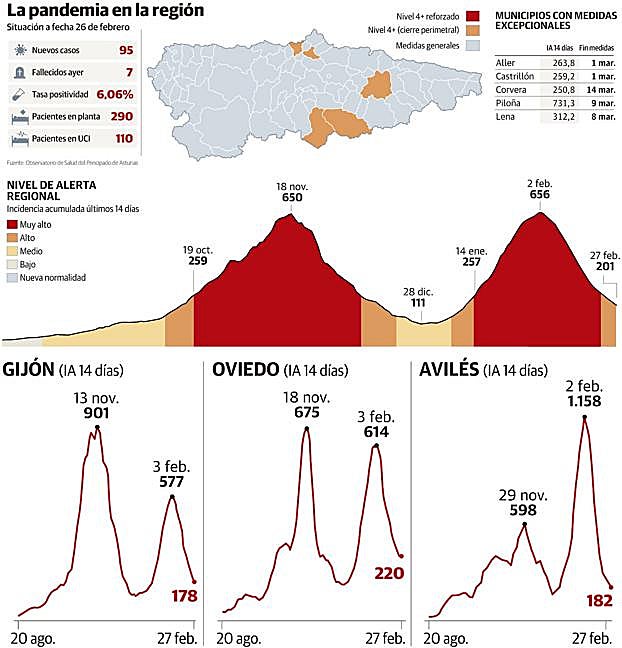 A su capacidad de contagio se añade un factor adicional, los grupos de edad en los que tiene mayor incidencia. El jefe de servicio de alertas y emergencias sanitarias del Principado, Miguel Ángel Prieto, señala que «los datos demuestran no solo que tiene una mayor transmisibilidad sino que afecta a los grupos de población más jóvenes, algo que estamos viendo en esta tercera ola ya que no se está comportando de la misma forma que en la segunda». Esto lo que ayuda a explicar que la incidencia actual en Asturias haya sido más potente en rangos de edad más bajos, a diferencia de lo sucedido en la primera y segunda parte de la pandemia. La explicación que maneja el equipo del HUCA es que, ante la mayor protección de la población más vulnerable (muchos de ellos ya vacunados), «el virus se busca la vida» y trata de infectar los organismos más expuestos a la interacción social. Por este motivo, Pedro Arcos conviene que «la clave está en la velocidad de la vacunación dado que aún queda tiempo para que le toque a una personas de 30 años; la estrategia inicial podía ser buenísima, pero se deben de tener la circunstancias cambiantes». El experto epidemiólogo no se refiere tanto a una redefinición de los grupos de edad como a que países como España, Francia o Alemania se miren en el espejo de otros como Israel e incluso Reino Unido que, a día de hoy, presentan altas tasas de inmunización en su población. El Gobierno israelí se marcó como objetivo tener al 50% de la población vacunada en marzo haciendo uso de bares y tiendas para inocular las dosis. En España actualmente solo el 2,6% de la población ha completado la pauta de vacunación -el 3,8% en el caso de Asturias- aunque esa cifra sube hasta el 7,6% si tenemos en cuenta aquellos que ya han recibido al menos una dosis.
