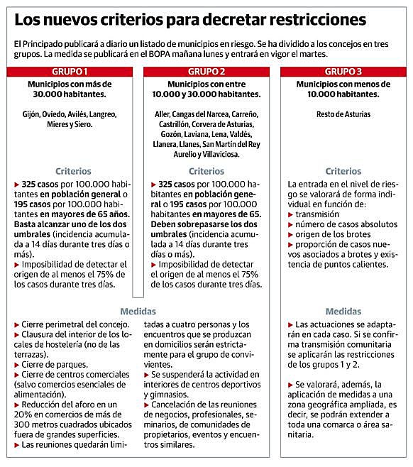 Los datos cambian cada día y esa es la razón por la que, a partir de mañana, la Consejería de Salud publicará un listado diario de los municipios con una mayor incidencia del virus y, por tanto, sujetos a las limitaciones. Pero algunos ya muestran unos índices elevadísimos que difícilmente tengan vuelta de hoja en las próximas horas. Ante la escalada del virus en los últimos días, todos los del grupo 1 (aquellos de más de 30.000 habitantes), tienen papeletas: Oviedo, Gijón, Avilés, Langreo, Mieres y Siero.