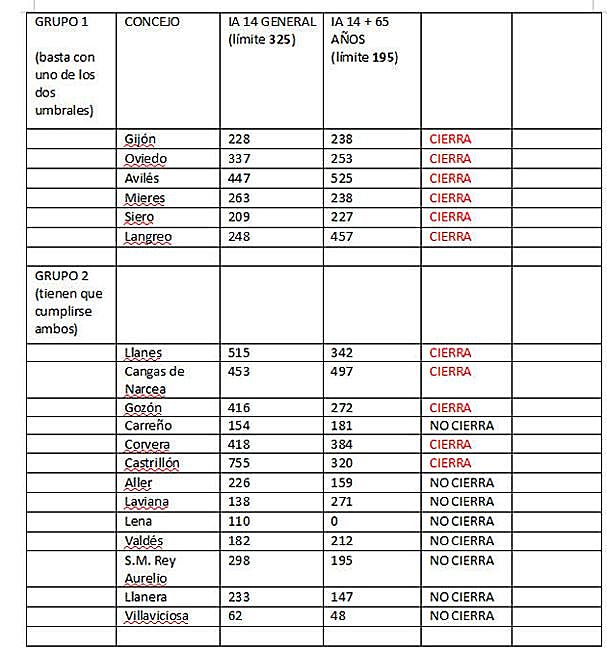 Los criterios para los concejos de este grupo indican que basta con que, durante al menos tres días, sólo rebasen uno de los dos índices de referencia marcados por el Principado: incidencia acumulada de 325 casos por 100.000 habitantes para la población general, y de 195 para el segmento de mayores de 65 años.