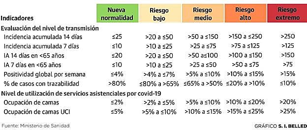 En el documento 'Actuaciones de respuesta coordinada para el control de la transmisión de covid-19', aprobado en el seno del Consejo Interterritorial del Sistema Nacional de Salud (SNS), se establecen ocho indicadores: incidencia acumulada por 100.000 habitantes en los últimos 14 y 7 días; la misma incidencia pero referida a la población mayor de 65 años; el porcentaje de positividad de las pruebas PCR; el porcentaje de casos con trazabilidad, y, por último, la ocupación de camas de hospitalización y de UCI por pacientes con covid. En función de estos resultados, cada territorio se situará en un nivel de riesgo. La escala va del 1 al 4.