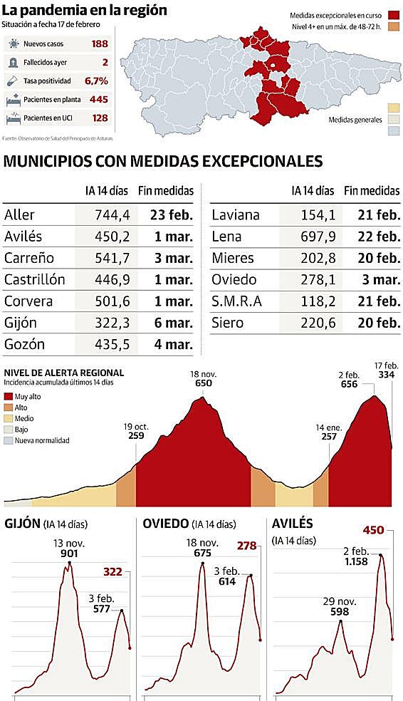 Junto a Siero, Salud decidió sacar ayer también de ese mismo nivel de máxima alerta a Mieres y San Martín del Rey Aurelio. Dejó a Gijón que, a pesar de la evolución favorable sigue por encima de los indicadores que posibilitan un cambio de escenario.