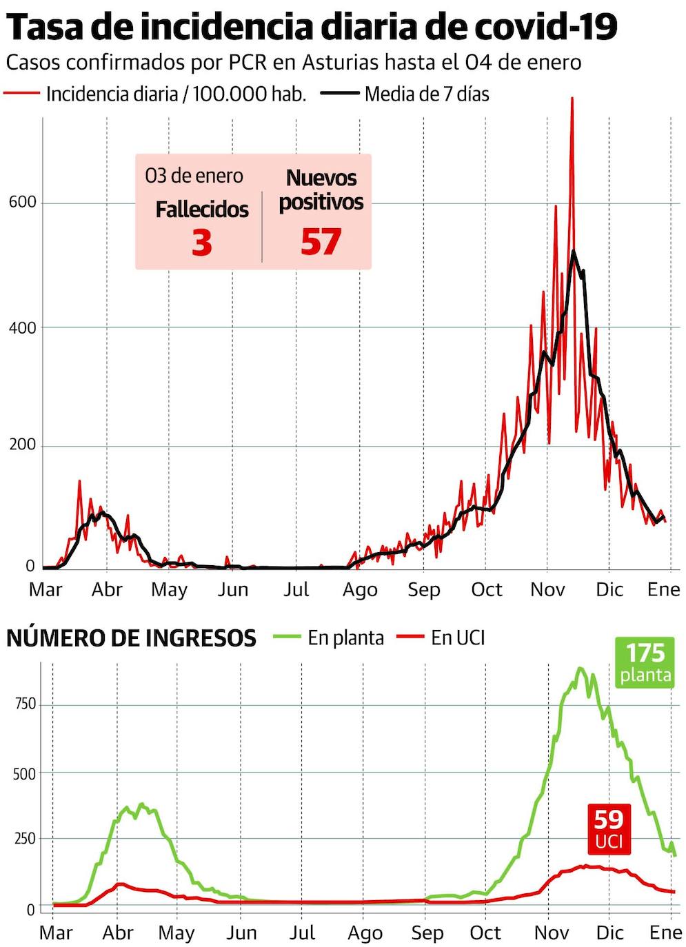 Superada la resaca de la Nochevieja, y el repunte de positivos -de nuevo por encima del centenar- ayer las cifras volvieron a dar cierto respiro. En las últimas 24 horas, 57 casos y una tasa de positividad del 4,19%. Según los datos facilitados por la Consejería de Salud, hubo que lamentar tres fallecimientos más.
