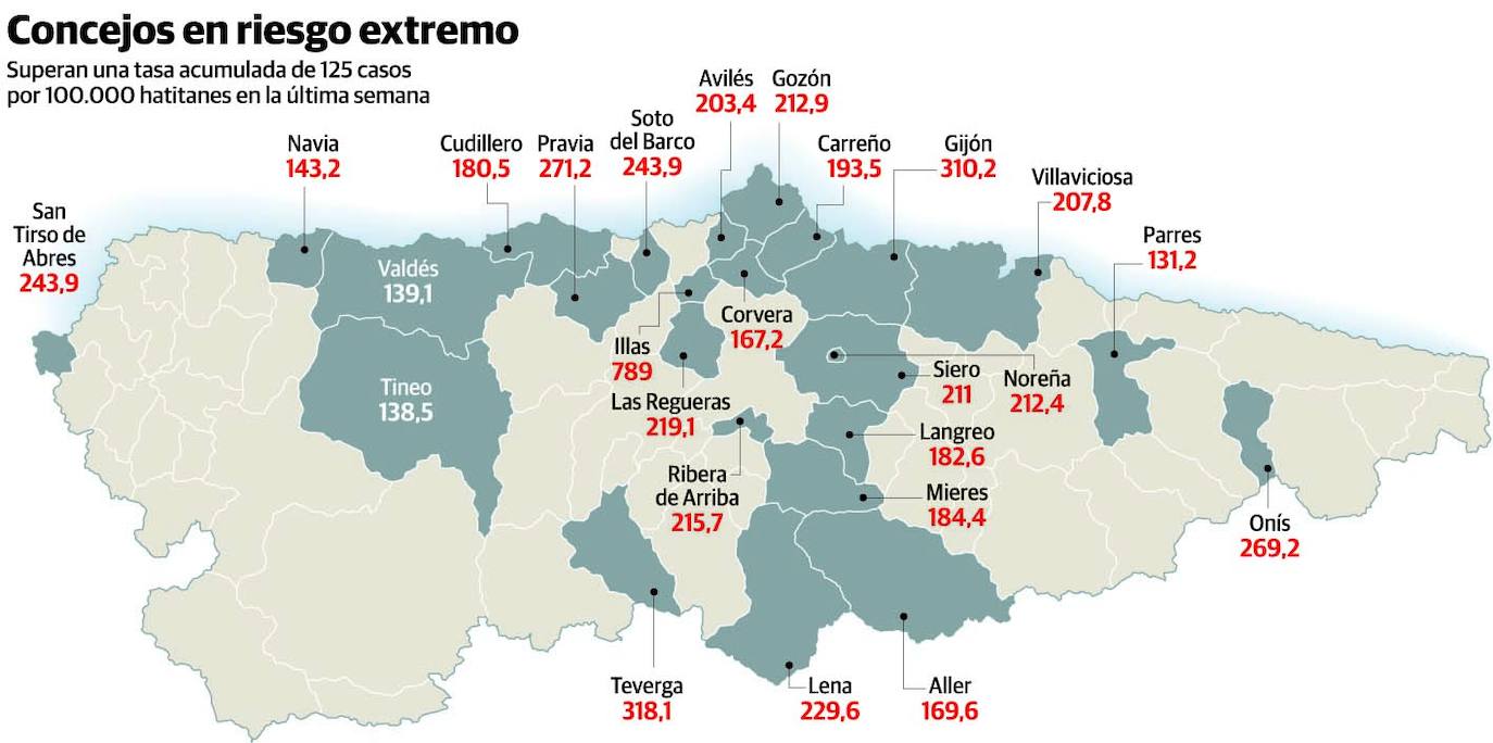 Gijón, Avilés, Teverga, Illas, Pravia, Villaviciosa, Siero, Gozón, Corvera, Noreña, Langreo, Lena Cudillero, Mieres, Ribera de Arriba, Onís, Carreño, Aller, Tineo, San Tirso de Abres, Soto del Barco, Las Regueras, Valdés, Parres y Navia. Estos veinticinco concejos asturianos tienen algo en común. Presentan una tasa de incidencia acumulada de contagios por coronavirus en los últimos siete días superior a los 125 casos por 100.000 habitantes. Y, por tanto, están en riesgo extremo, el escalón más alto para ese factor.