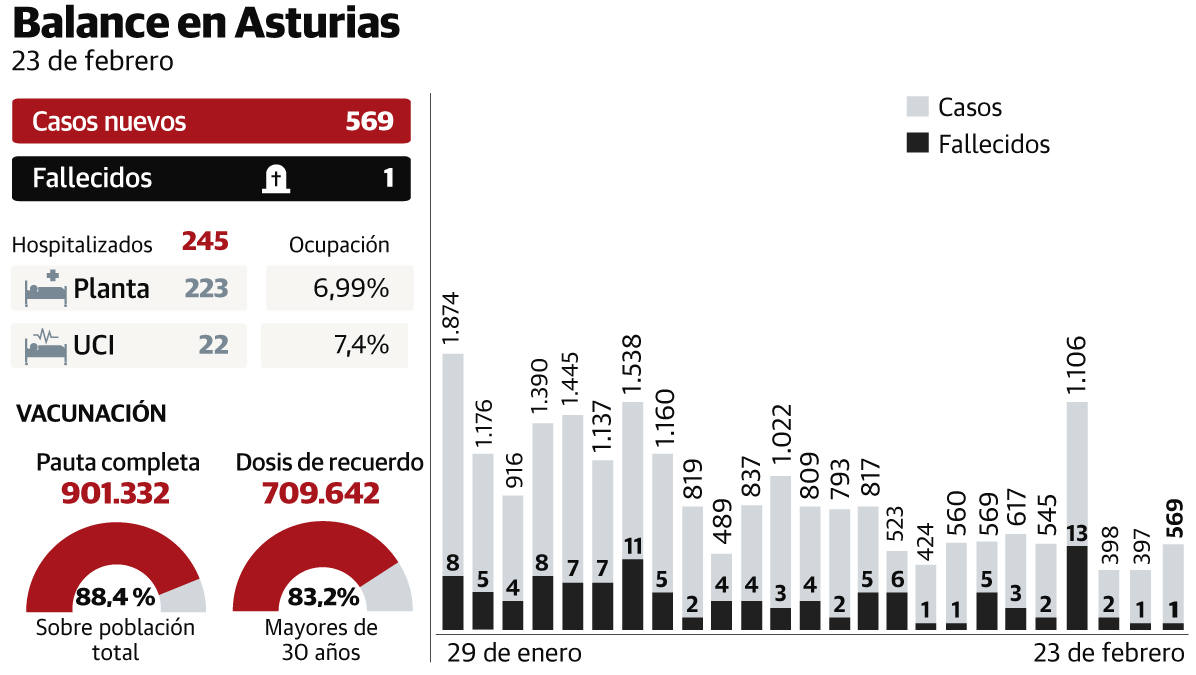 Actualmente hay 231 pacientes hospitalizados con sospecha o confirmación de covid, de los que 210 están en planta y otros 21 permanecen ingresados en UCI. Ayer la cifra total ascendía a 245 personas. De esta manera, la ocupación total por covid en los hospitales es del 6,60% y en el caso de las UCIs se sitúa en el 7,07%. Asturias mantiene un nivel de alerta medio (2 de 4).