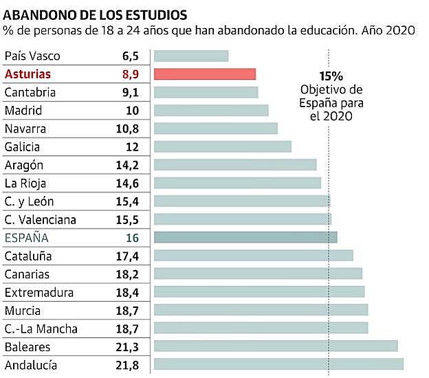Esa es la radiografía general en España y no dista mucho la asturiana, aunque la región está en situación más ventajosa que la media. En el caso de Asturias, uno de cada cuatro alumnos ha repetido al menos un curso cuando llega a los 15 años. El dato se extrae del análisis de la denominada 'tasa de ideoneidad', es decir, cuántos alumnos están en el curso que le corresponde por edad. Así, mientras a los 8 años el 95% de los estudiantes lo están, cuando llegan a los 15 años son ya el 74%. Es decir el 26% restante se ha quedado retrasado en el camino. Y lo habrá hecho, principalmente, en primero de Secundaria, el curso que sufre las mayores tasas de repetición. Todas las cifras corresponden al curso 2018-2019, último del que hay cifras oficiales publicadas por el Ministerio de Educación.