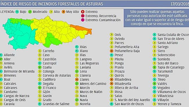 Cuatro concejos asturianos presentan este sábado día 17 de marzo índice 'muy alto' por riesgo de incendios forestales. Se trata de una escala de cinco constituida por , de menor a mayor, 'bajo', 'moderado', 'alto', 'muy alto' y 'extremo'.