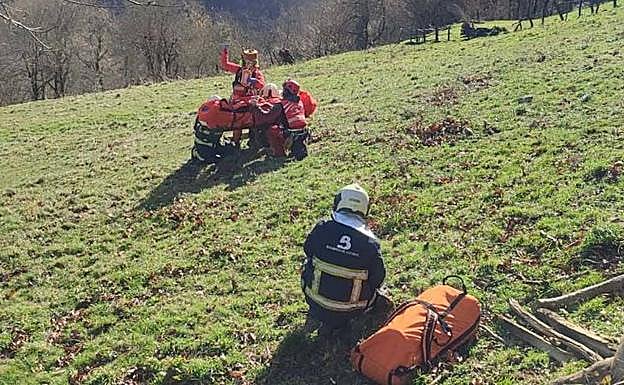 Una vez en la zona, los integrantes del equipo de rescate accedieron al afectado que al parecer estaba podando un cañón de una castañal, subido al propio árbol, cuando por causas que se desconocen, quedó atrapado por la rama que estaba cortando. El bombero rescatador que accedió al herido, lo aseguró colocándole el triángulo de rescate. A continuación, con la ayuda de los efectivos de bomberos del parque de San Martín, montaron una reunión con la que bajaron al varón accidentado al suelo.