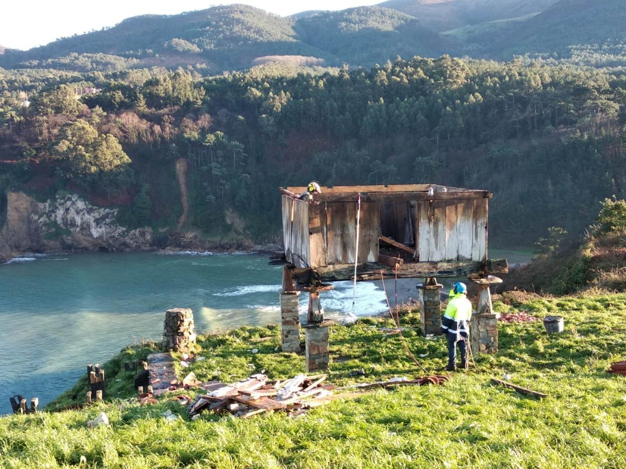 Apenas queda en pie la estructura del suelo del hórreo del Campo de La Garita, en Cadavedo, escenario de la popular romería de La Regalina tras la segunda jornada de trabajo manual para lograr salvar este elemento etnográfico que amenazaba con precipitarse por el acantilado tras el deslizamiento de tierras del pasado miércoles. Ayer se terminó de desmontar la cubierta y concluyó el desarme de las paredes del hórreo. «Se trabaja despacio. La intención es terminarlo mañana -por hoy-», indicó Marcos Fernández, presidente de la Sociedad Popular La Regalina.