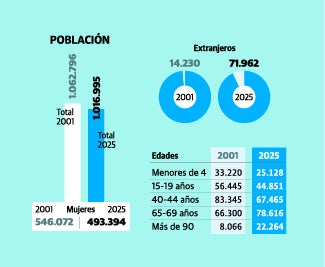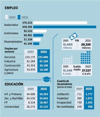Aunque poco, en el Paraíso Natural, eslogan nacido antes del nuevo milenio, siguen viviendo más de un millón de habitantes, gracias a la llegada de más de 70.000 extranjeros. En un censo que, como hace veinticinco años, hay más mujeres que hombres y que peina canas, con casi tantos nonagenarios, 22.264, como menores de 4 años, 25.128, lo cierto es que el desempleo es hoy menor que hace 25 años. Están en el paro 41.200 asturianos frente a los 53.600 de 2001. Y trabajan 439.209 personas. ¿Hace 25 años? 376.323. Eso sí, el sector que absorbe a la mayoría es el de servicios. La construcción se redujo a la mitad. El campo y la mar, a una cuarta parte.