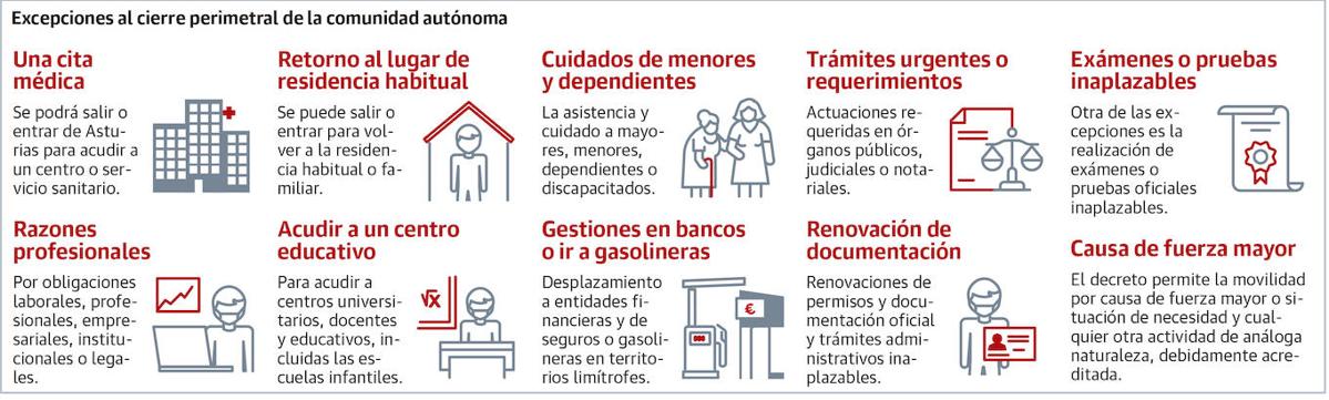 Gijón, Oviedo y Avilés mantienen los cierres perimetrales, ahora que tampoco está permitido salir de Asturias. Sí hay excepciones para uno y otro caso y en general son las mismas, salvo una: si usted es deportista federado puede salir de las ciudades confinadas para ir a entrenar o competir, pero no puede salir de la comunidad autónoma. Los deportistas profesionales sí, ya que se considera motivo laboral. Para salir de Gijón, Oviedo y Avilés se mantienen las mismas excepciones: acudir al médico, al trabajo, a estudiar... Y sí, también al banco. Lamentaba ayer un vecino de Cabrales que necesitaba ir a Gijón, a una oficina bancaria, y que los cuerpos de seguridad no habían sabido responderle. Sí, puede ir al banco a Gijón. De hecho, incluso podría salir de Asturias por ese motivo.