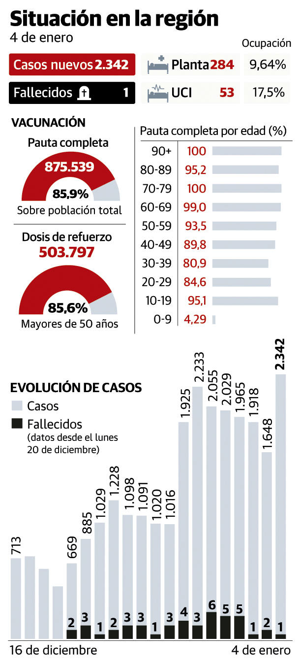 La Consejería de Salud notificó ayer 2.342 contagios por coronavirus, la cifra diaria más alta en los 22 meses de pandemia en la región. Las últimas semanas se han ido encadenando varios récords. El dato del miércoles fue la quinta vez que se superó el umbral de los dos mil casos, la primera vez este año. El hito de esta sexta ola tuvo lugar el 22 de diciembre, día en el que Salud notificó 1.029 casos, algo insólito por entonces dado que nunca se había superando el millar. El crecimiento en solo veinticuatro horas ha sido de 653 positivos, de 1.689 a 2.342, mostrando las primeras evidencias de los efectos de la Nochevieja. Una hipótesis que tendrá que ser refrendada aún en las próximos días.