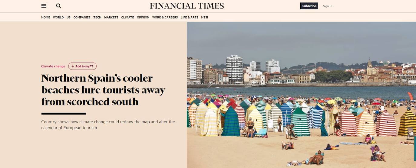 Una imagen de la playa gijonesa de San Lorenzo y este titular: 'Las playas más frescas del norte atraen a los turistas y los alejan de las calurosas del sur'. Las cifras de récord del sector turístico asturiano no dejan indiferente ni al Financial Times. El diario británico se ha hecho eco de este 'boom' turístico en el norte de nuestro país (concretamente habla de Asturias, Cantabria y Galicia) con una información en la que destaca el aumento notable de turistas extranjeros que durante este pasado verano eligieron el norte y no el sur para disfrutar de sus días de asueto.