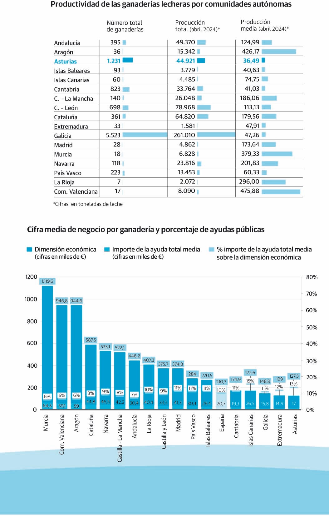 Asturias es, con unas 50 vacas (en realidad, técnicamente son UGM, unidades de ganado mayor, pero equivalen a vacas de más de dos años, en tanto que las menores de esa edad cuentan como 0,6 UGM), la región con ganaderías medias más pequeñas, mientras que regiones como Castilla-La Mancha, Navarra o Cataluña pasan bien de las 200 y Aragón, Valencia y Murcia se sitúan por encima de las 400 vacas por ganadería de media. Para entender bien esto hay que anotar, por ejemplo, que Valencia multiplica por ocho el número de vacas por explotación de Asturias, pero su productividad por explotación no se multiplica por ocho, sino por más de trece. O Aragón, que también multiplica por ocho el tamaño medio en cabezas, lo hace por doce en producción.