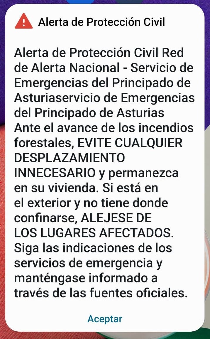 Además, se ha enviado un mensaje de alerta a través del sistema ES-Alert a los habitantes de varios concejos asturianos que están o podrían verse afectados por los incendios. Los municipios incluidos en esta comunicación son: Cangas del Narcea, Ibias, Degaña, Somiedo, Teverga Quirós, Ponga, Lena, Aller, Caso, Cangas de Onís, Onís, Cabrales, Amieva, Peñamellera Alta y Peñamellera Baja.