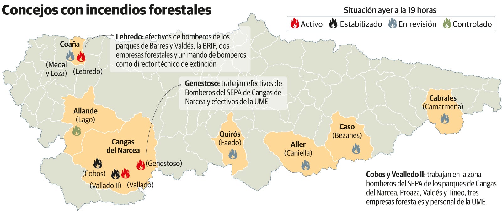 Anoche, permanecían activos en Asturias diez incendios. En Allande, los bomberos tenían controlado un foco enLago; en Cabrales, en la zona de Camarmeña, permanecía activo un fuego en Camarmeña que obligó a cerrar, el martes, la ruta del Cares; en Cangas del Narcea los efectivos delSEPA trabajaban en labores de refrigeración de un incendio en Cobo, mientras en Vallado se movilizaron efectivos de bomberos del SEPA y una empresa forestal. En este mismo concejo, en Genestoso, se desplegó la UME y efectivos de Bomberos del SEPA de Cangas del Narcea e Ibias;en Coaña se trabajaba en las labores de extinción de un incendio en Lebredo y en trabajos de revisión de otro fuego en Medal y Loza; en Caso, miembros de la Guardería de Medio Natural revisaban un incendio declarado en Bezanes; Quirós se encontraba también en revisión un fuego en Lindes y otro enFaedo, al igual que el sofocado en Caniella (Aller).
