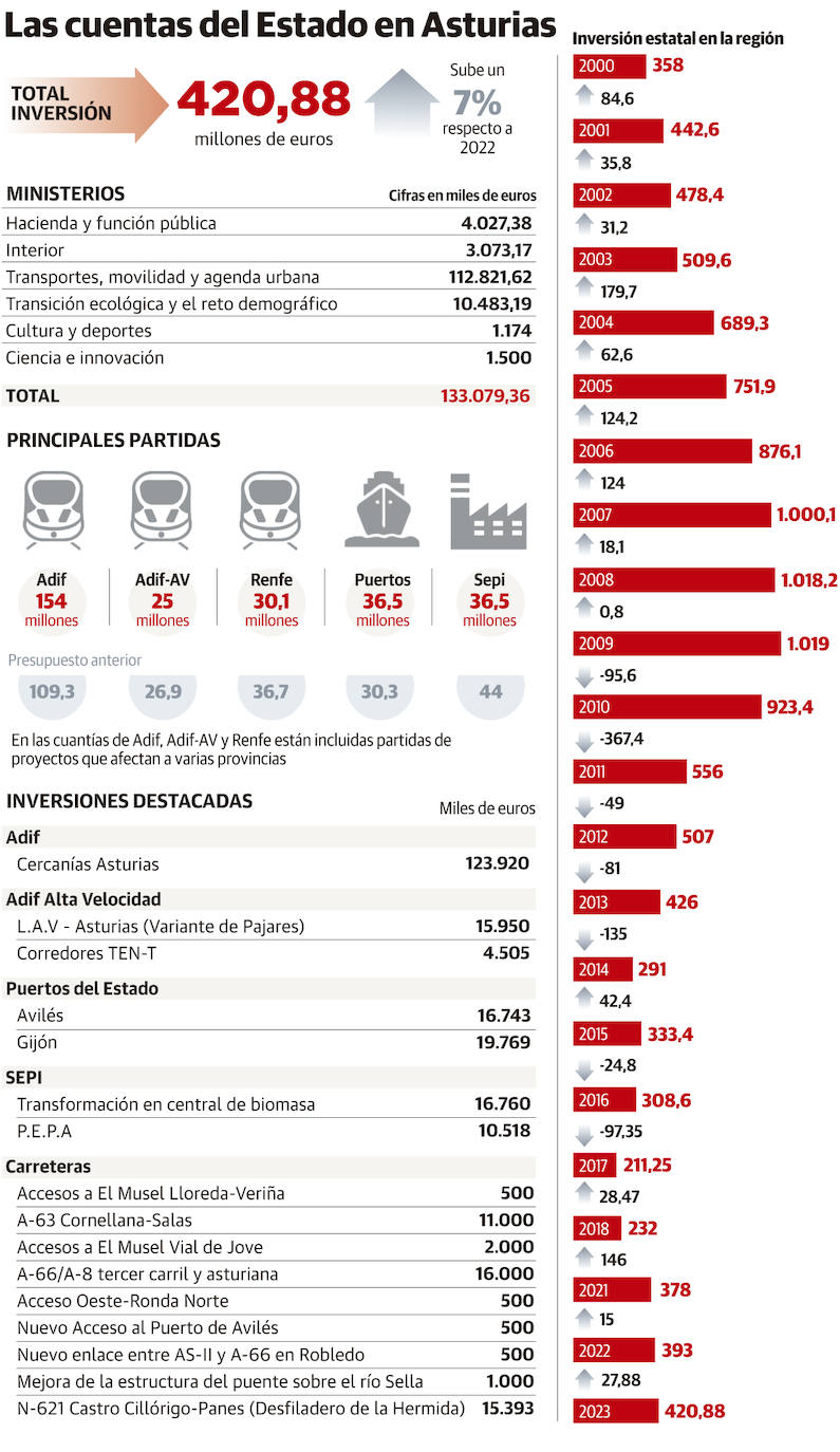 La inversión pública prevista para Asturias en los Presupuestos Generales del Estado de 2023, casi 421 millones de euros, supone un incremento del 7% con ... respecto a la del año en curso y da continuidad a la tendencia alcista del último lustro. Sin embargo, el montante que reserva ahora el Gobierno de Pedro Sánchez para la región es similar al que se estableció en las cuentas estatales de hace ya diez años por el entonces ministro de Hacienda, Cristóbal Montoro.