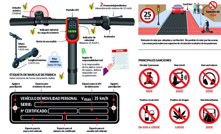 Primero fue la pandemia del covid. Después, la subida del precio de los carburantes. La suma de ambos factores, además de algún otro, se tradujo en un aumento de la venta de patinetes eléctricos. Un hecho que, más allá de verse en la calle, lo reconocen también las principales superficies que los comercializan. Así que desde hace unos meses este nuevo Vehículo de Movilidad Personal (VMP) -según lo define la Dirección General de Tráfico (DGT)- se ha convertido en uno más de la vía pública, en la que también ha provocado alguna que otra colisión y más de un conductor se ha llevado una sanción. Por ejemplo, en Asturias, en lo que va de año, la Policía ha denunciado en la capital a 112 usuarios de patinete por dar un mal uso al vehículo. Por eso, la regulación avanza y trata de ponerse a la altura cuando un elemento irrumpe así y urge una normativa. La última serie de medidas entrará en vigor el 22 de enero del próximo 2024, cuando todos los modelos que se comercialicen deberán estar homologados por la DGT. Este trámite, además de obligar a unas determinadas condiciones técnicas y de velocidad, también conllevará un equipamiento obligatorio.
