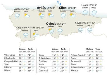 En cuanto a las temperaturas en las principales ciudades de la región, Oviedo registrará una mínima de 16 grados y una máxima de 24; en Gijón se oscilará entre la mínima de 18 y la máxima de 23, y Avilés entre una mínima de 18 y una máxima de 23.