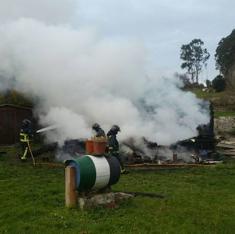 Efectivos de bomberos del parque de Llanes trabajan para extinguir el incendio originado en una vivienda vacacional situada en la localidad llanisca de Poo. La construcción, levantada en madera, ha quedado calcinada en su práctica totalidad y tan solo se pudo salvar parte del cuarto de baño. El fuego ha provocado daños materiales, pero ninguna persona ha resultado herida.