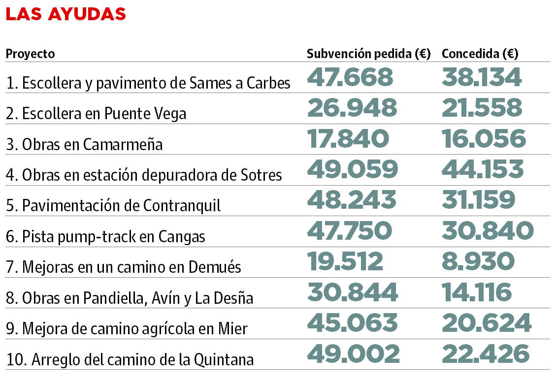 El Ayuntamiento de Cabrales se lleva más de 60.000 euros para trabajos interiores de adecuación y mejora de la estación depuradora de aguas residuales de Sotres y para las obras de restauración y recuperación del entorno de Camarmeña. En concreto, 44.153,32 y 16.056,32 euros. El concejo de Amieva, que el pasado año tuvo que renunciar a la subvención de 6.000 euros concedida para la mejora de un camino, recibirá también buena parte de las subvenciones de la convocatoria ordinaria de este año. Serán 38.134,86 euros para la construcción de una escollera de contención y para mejoras en el pavimento en el camino de Sames a Carbes; y 21.558,41 euros para la construcción de otra escollera de contención en Puente Vega.