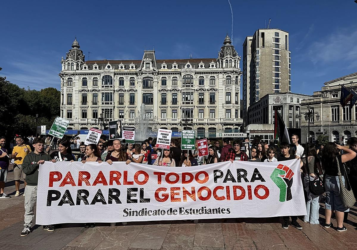 'Paremos el genocidio contra el pueblo palestino. 'Ruptura con Israel ya'. Bajo ese lema, los estudiantes asturianos y los de toda España, desde la ESO hasta la Universidad (incluye Bachillerato y Formación Profesional también) estaban llamados este jueves a una huelga convocada por el Sindicato de Estudiantes. Además del paro, que afecta a toda la jornada lectiva, tanto la mañana como la tarde, a las 12 ha habido dos manifestaciones, una en Gijón, en la plaza del Parchís, y otra en Oviedo, en La Escandalera, a las 12 horas. También se sucederán concentraciones y manifestaciones en toda España.