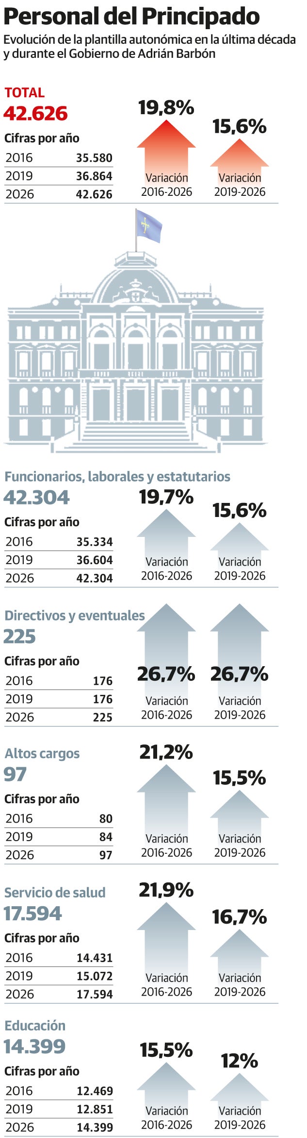 Un análisis de la evolución de la plantilla en general en la última década confirma un crecimiento mucho más acelerado en la etapa de Barbón, con especial intensidad en la previsión económica aprobada esta semana para el año 2026, cuando se prevé incorporar a la plantilla 1.528 empleados más, lo que supone un crecimiento del 3,7% interanual, muy por encima del crecimiento medio anual del 2% registrado en la última década, o del 2,2% de media registrada con el actual Gobierno.