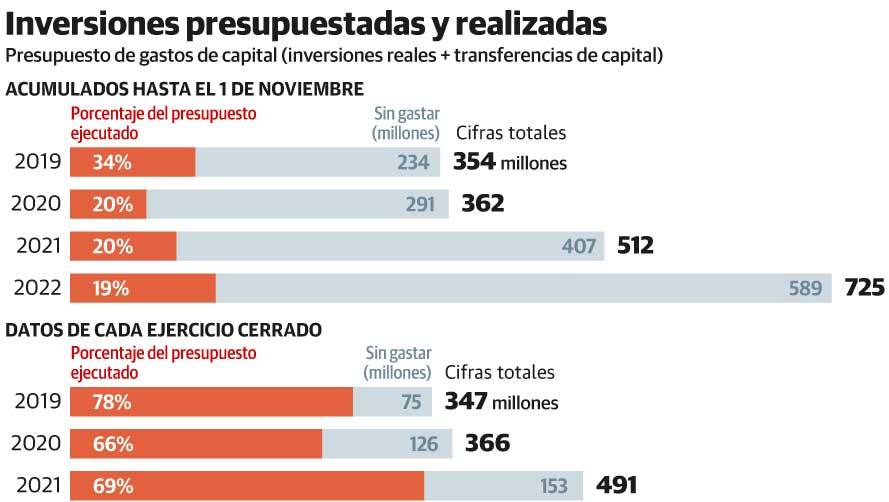 Ambas partidas, inversiones reales y trasferencias de capital, se unen en lo que se denomina gastos de capital. Visto así hay 725 millones para todo el año y solo han salido de la caja 136. Queda el 81% por ejecutar.