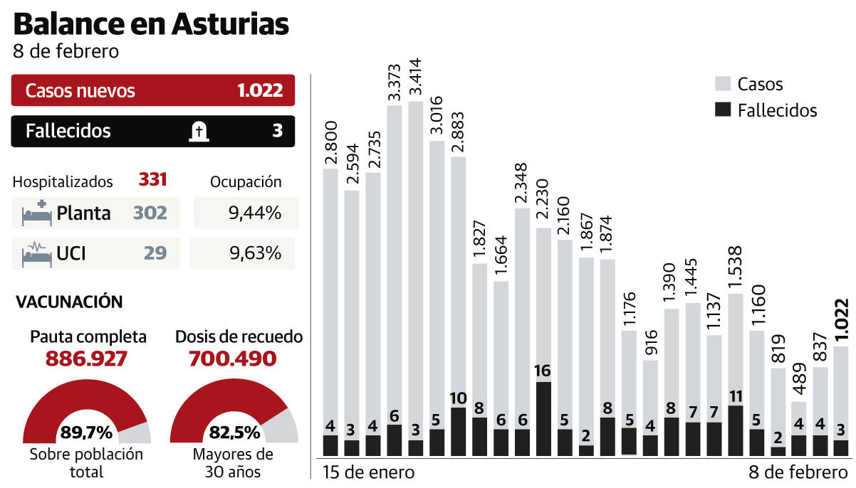 Asturias es una de las comunidades con mayor cobertura vacunal. Más del 90% de la población tiene puesta alguna dosis, y a más de 700.000 personas ya se les ha inoculado la profilaxis de recuerdo. Este avance en la vacunación coincide con una situación epidemiológica mucha más favorable a la que venía registrándose desde la segunda quincena de diciembre.