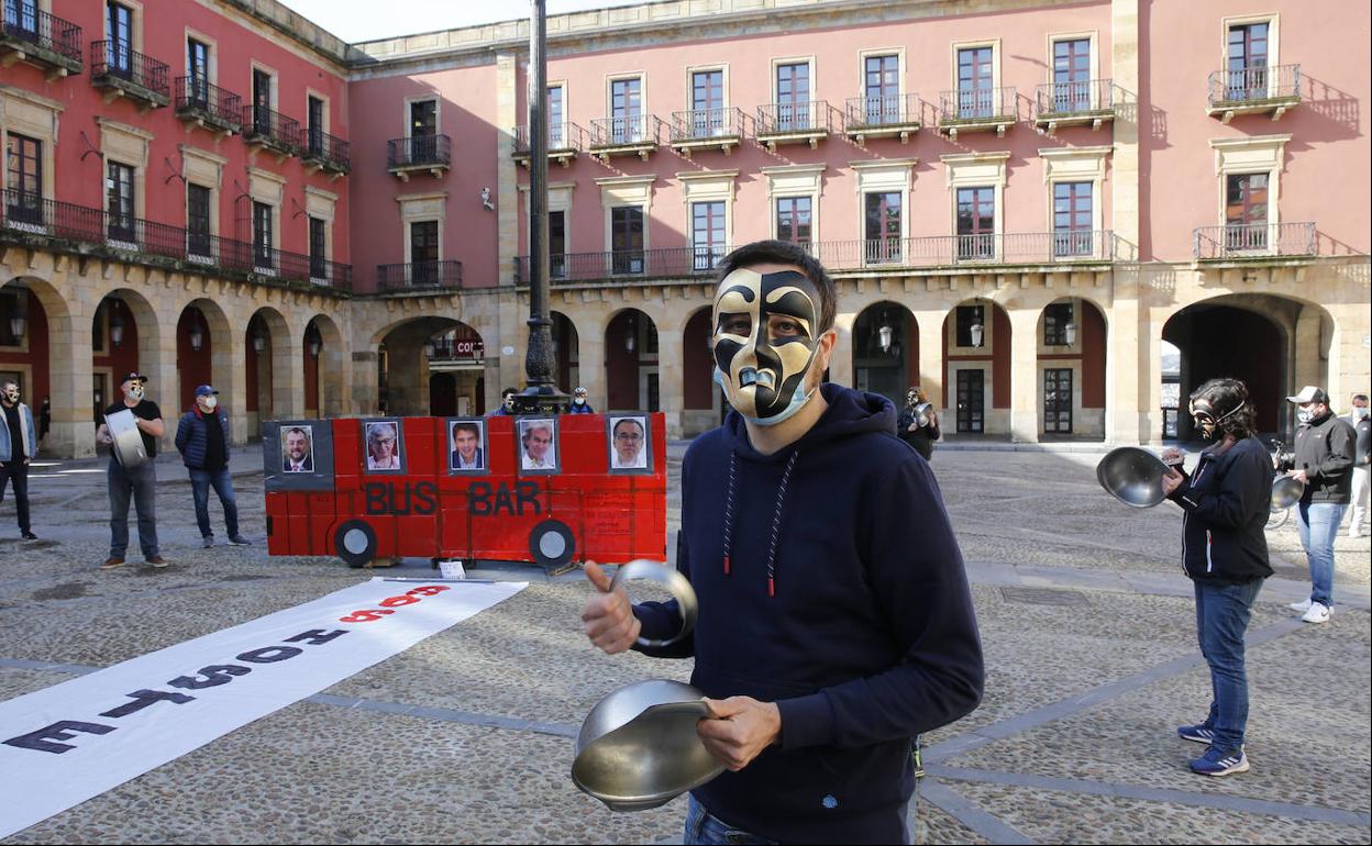 Asimismo, la plataforma ha confeccionado un 'bus-bar', tal y como se ha visto en la pasada concentración del lunes en Avilés, en el que han subido como conductor al presidente del Principado, Adrián Barbón, y como pasajeros a la alcaldesa de Gijón, Ana González, a José Luis Almeida, presidente de Otea Hostelería y Turismo de Asturias, al director del Centro de Coordinación de Alertas y Emergencias Sanitarias, Fernando Simón, y al consejero de Salud, Pablo Fernández, en una crítica a las restricciones sanitarias «que no se respetan en los autobuses», reivindicaron. Un vehículo que indica sus propias indicaciones 'de seguridad': «con aforo ilimitado, sin desinfección, sin distancias y sin ventilación en su interior».