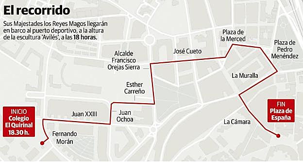 El recorrido sufre una pequeña modificación respecto al de años anteriores. Tras salir del colegio, la comitiva irá por la calle de Juan XXIII, pero en lugar de llegar hasta la plaza de Los Oficios, se desviará por Juan Ochoa y llegará a Orejas Sierra por Esther Carreño. A partir de ahí, el resto continúa igual: se gira en José Cueto hasta la plaza de La Merced, de ahí a la plaza de Pedro Menéndez y La Muralla, para hacer el último tramo por La Cámara y finalizar en Plaza España.