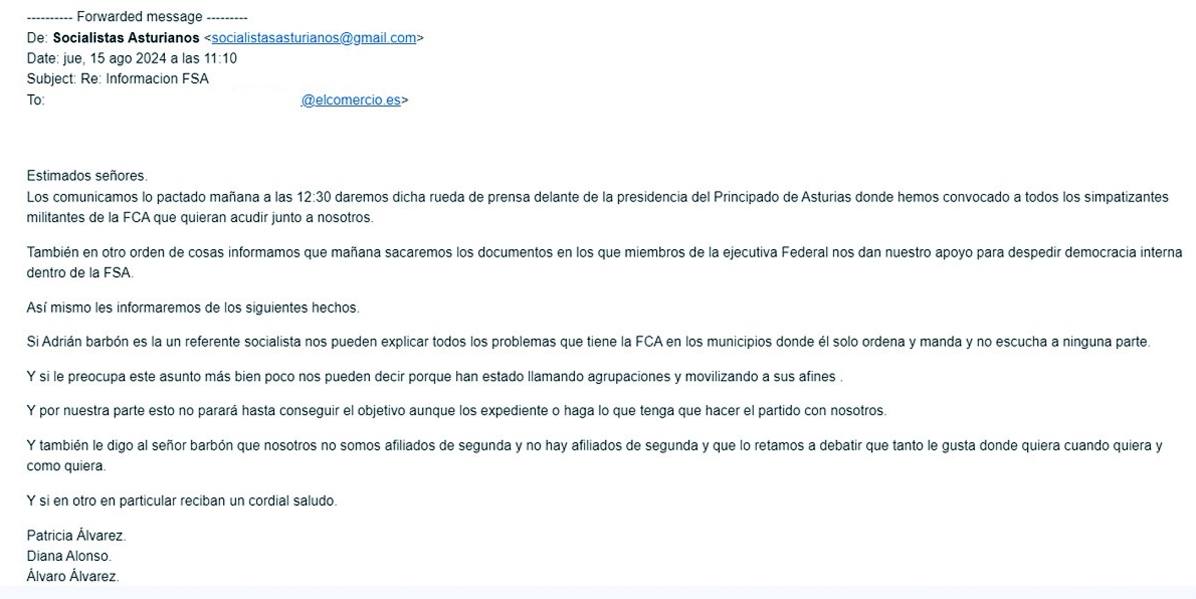 Todo empezó el viernes 9 de agosto. A las 11.23 horas llegó a la Federación Socialista Asturiana un mail desde enviado desde la cuenta ... socialistasasturianos@gmail.com en el que se informa de que varios cargos públicos y afiliados se habían unido para presentar una «moción de censura» contra la «junta directiva» del partido. Ese mail, firmado con el nombre de Pelayo, hizo saltar las alarmas en el partido inicialmente, pero fueron disipándose a medida que transcurría el día tras comprobar cómo varios de los cargos del partido que se han mostrado críticos con la actual ejecutiva se desmarcaban de forma clara y rotunda de ese supuesto grupo. Además, algunos de los términos utilizados en el correo, como «junta directiva», órgano que en el PSOE no existe, o «moción de censura», mecanismo que tampoco está recogido en los estatutos hizo saltar las alarmas. Por la tarde, llegó otro mail a la FSA, en los mismos términos que el anterior, aunque corrigiendo los errores en la referencias anteriormente citadas. El correo, en esta ocasión, iba firmado por varias personas, pero ninguna de ellas constaba en los registros de afilados del PSOE. En ese momento, en la FSA ya se hablaba de 'troleo'.