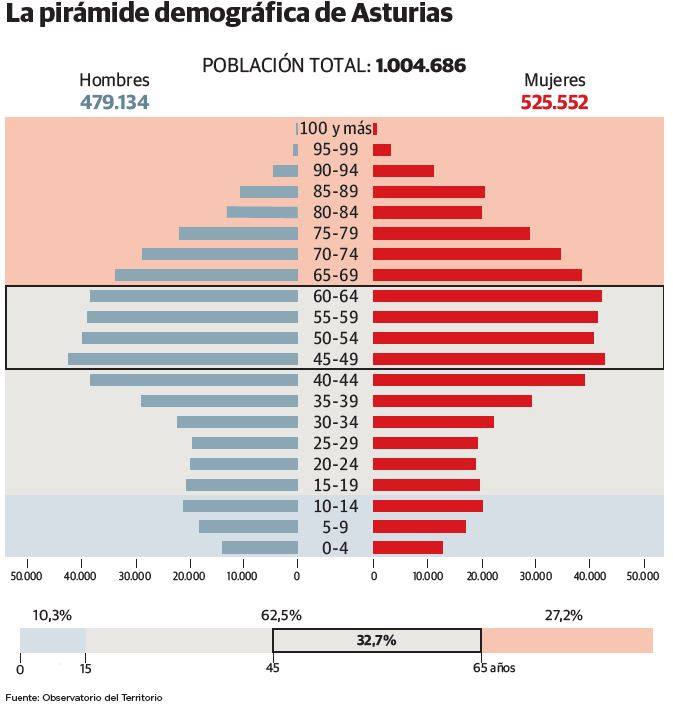 El ensanchamiento del que habla Daniel Herrera está formado por los asturianos que tienen ahora entre 45 y 65 años. Este grupo de población, el más voluminoso de la estructura demográfica asturiana, empezarán a sobrecargar las prestaciones ligadas al envejecimiento en menos de quince años. La dinámica «es difícil de cambiar» a estas alturas, aseguran los expertos. Aun así, «se deberían estar adoptando medidas» de cara a evitar males mayores: «Preparémonos; adaptemos el sistema para que el impacto sea lo menor posible».